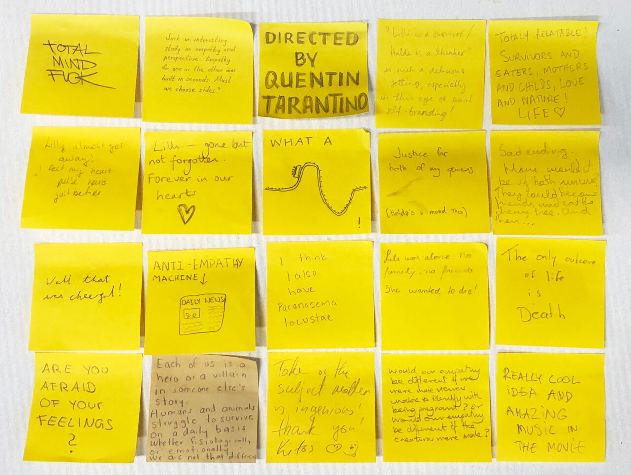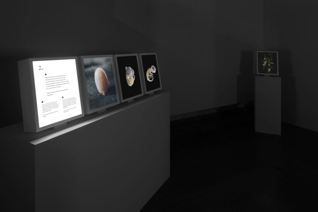 The artwork Hulda & Lilli (2023) examines empathy through storytelling. The work is an inventive human experiment, which aims to draw out an emotional reaction and encourages viewers to probe into the making of their feelings. The immersive installation offers two paths with different perspectives – who or what will you empathize with? In the work, anthropomorphism – seeing human-like features in other animals and beings – is calculated, and the visitors might be led astray at a first glance.