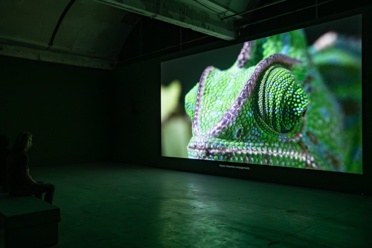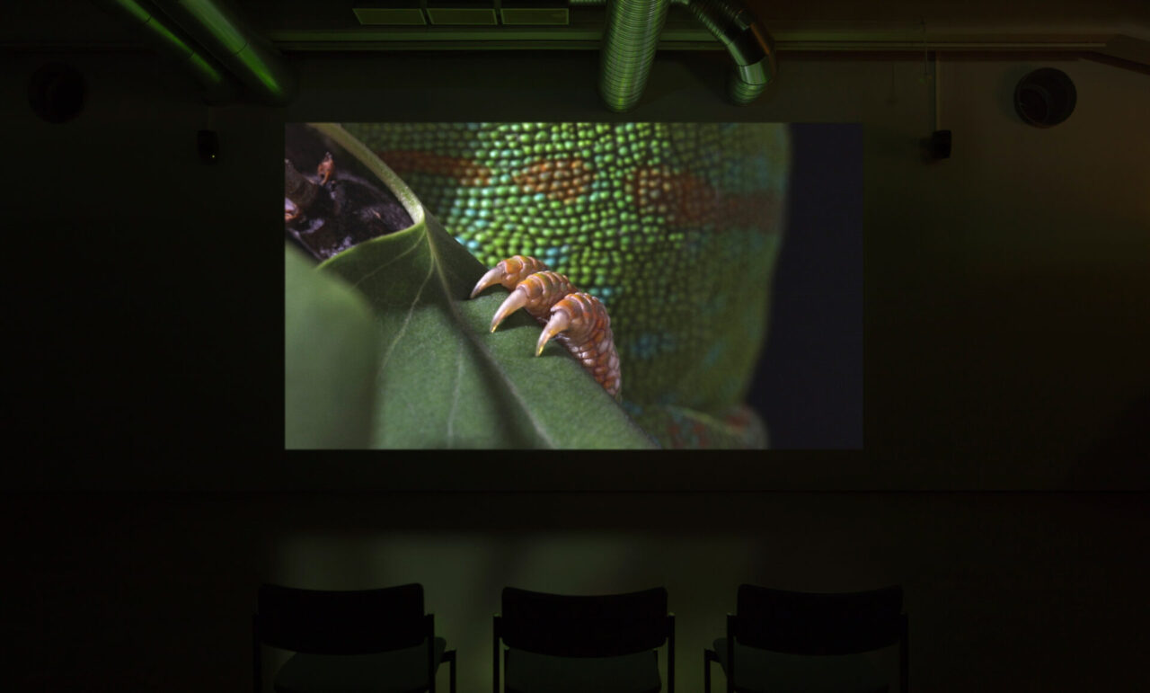 The debriefing room of the artwork includes interviews: Imagination feeds empathy (Vollberg), Nature documentaries record culture (Koskinen), Chameleon is a party animal / Migratory locusts are the Jekylls and Hydesof the insect world (Ollonen), and a discussion Is Art Supposed to Feel Like Something? between curator Tiina Rauhala and Maija Tammi, and essay Fabulator of the Liminal by writer, curator Ariane Koek.